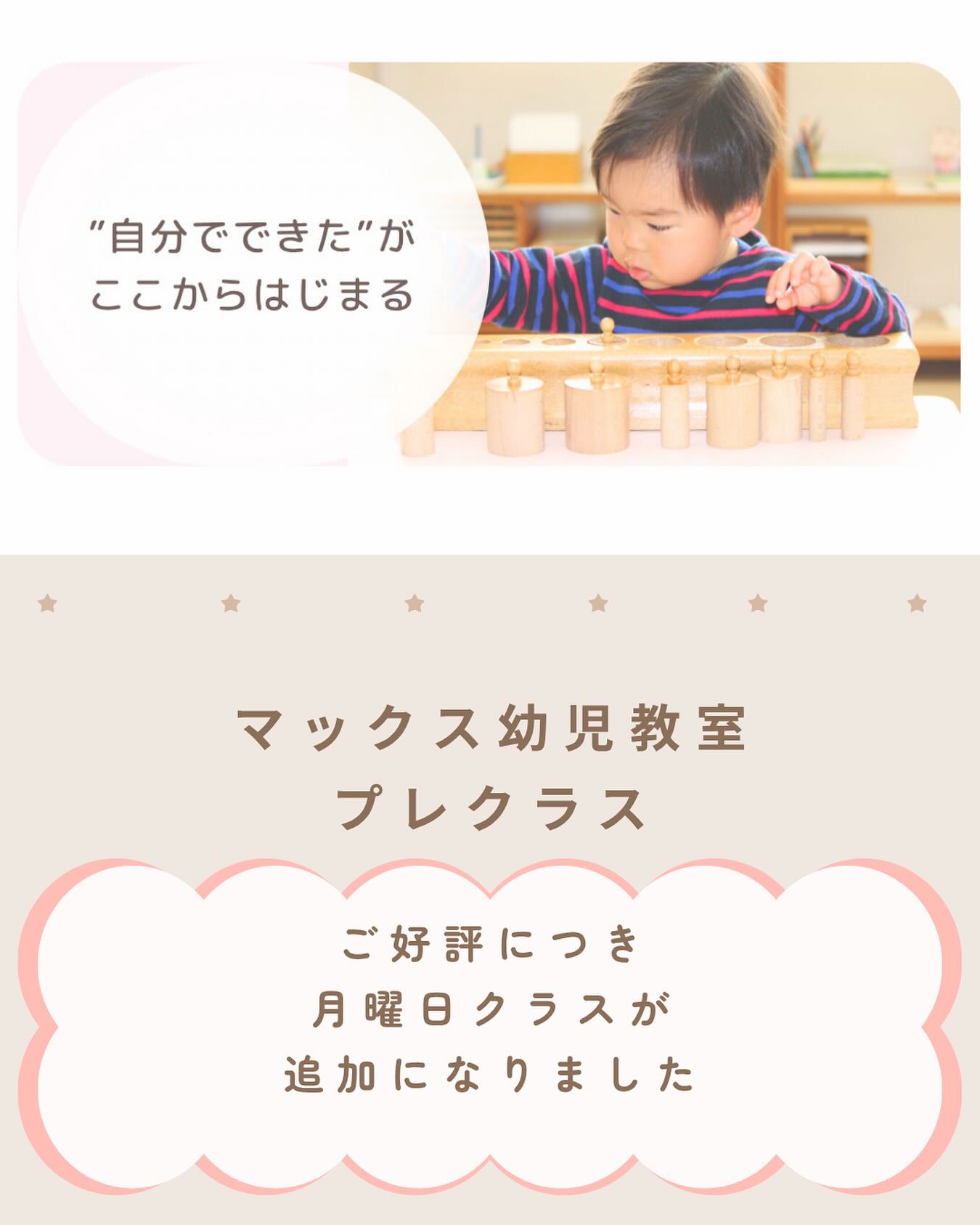 【マックス幼児教室】 1歳半からのプレクラスは、現在開講の水曜日クラスがご好評につき満席となりました。 そのため、10月より月曜日クラスを開講いたします! 1歳5ヶ月より体験可能です。 ホームページよりご予約ください。       #マックス幼児教室 #モンテッソーリ #モンテッソーリのお教室 #幼児教室 #豊洲幼児教室 #東雲 #豊洲 #有明 #1歳半から通える教室 #1歳半からの習い事 #一歳半からのモンテッソーリ